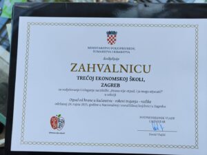 U ponedjeljak 29. rujna u Nacionalnoj i sveučilišnoj knjižnici u Zagrebu, učenici drugih i četvrtih razreda naše škole su, u sklopu fakultativnog predmeta Škola i zakednica s nastavnicom Martinom Šuljić, sudjelovali na Izložbi Hrana nije otpad, i ja mogu utjecati. Naši učenici su izradili plakate i tako predstavili temu u sekciji 5 “Otpad od hrane u kućanstvu – rokovi trajanja – razlike”. Izložbu je organiziralo Ministarstvo poljoprivrede, šumarstva i ribarstva te je tom prigodom dodijelilo zahvalnicu našoj školi za sudjelovanje i izlaganje.
